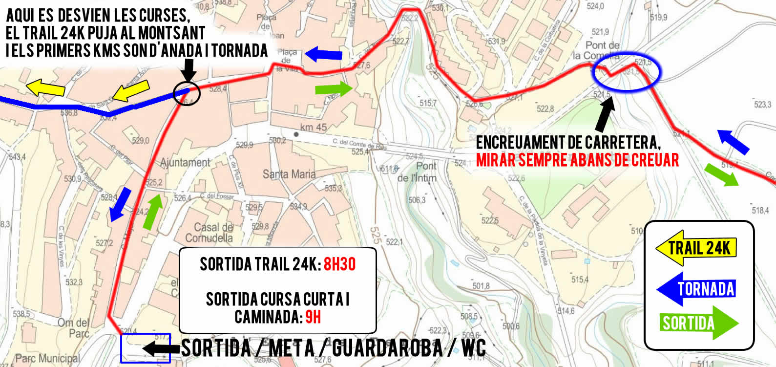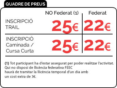 Concentració Participants: 8:15h participants del TRAIL (24K) / 8:45h participants de la CURSA CURTA i CAMINADA (11K). Parc infantil al costat de l'Oficina de Turisme.